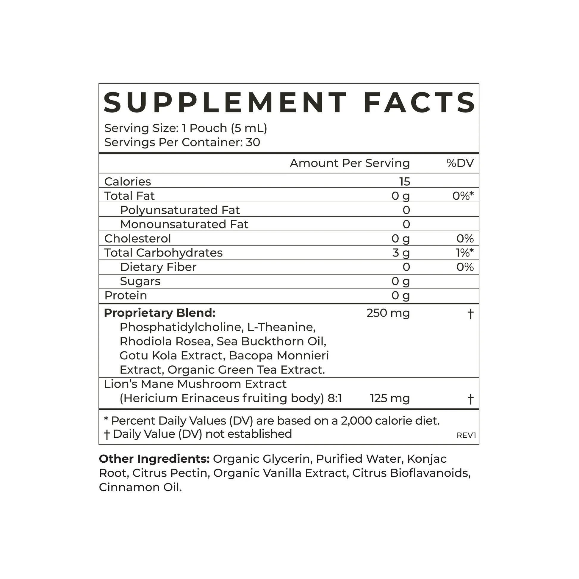 Proprietary Blend: Phosphatidylcholine, L-Theanine, Rhodiola Rosea, Sea Buckthorn Oil, Gotu Kola Extract, Bacopa Monnieri Extract, Organic Green Tea Extract, Lion’s Mane Mushroom Extract (Hericium Erinaceus fruiting body) 8:1.